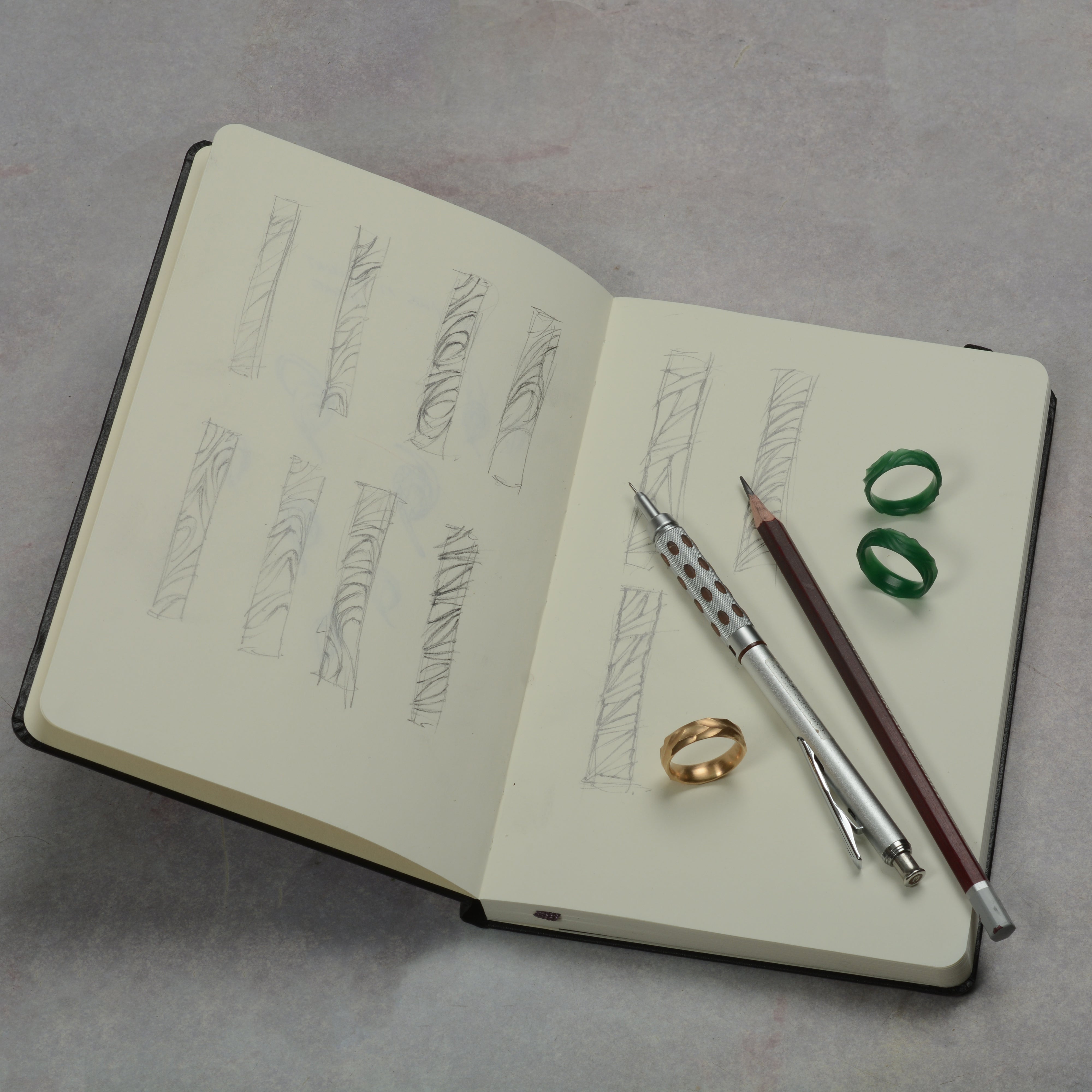 The next step is to refine the ideas into a series of designs for you to choose from. To do this we will usually sketch on paper and may also make models in wax or metal.