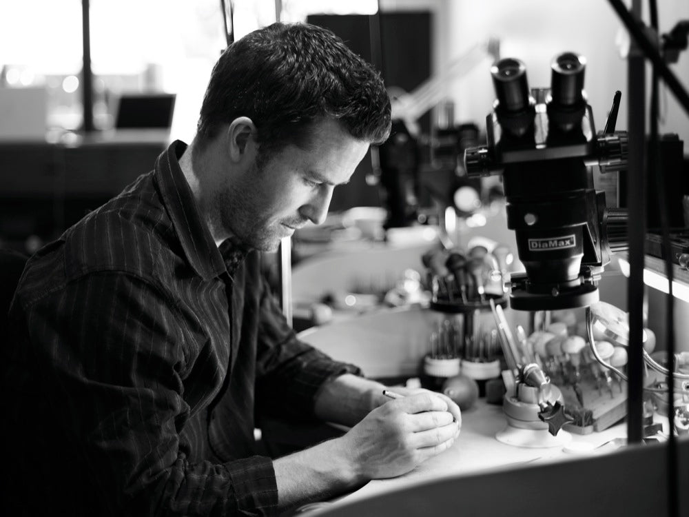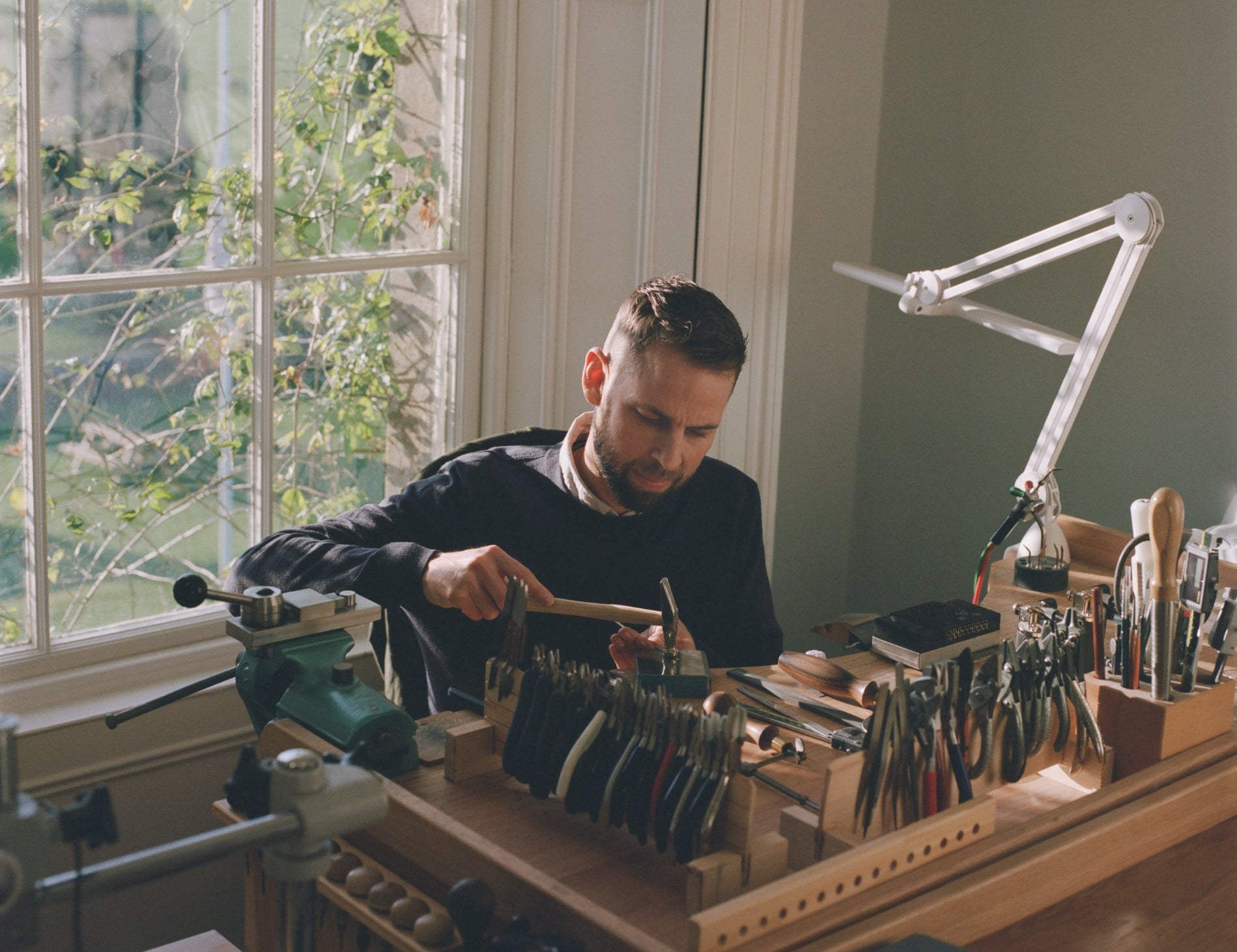 The McCaul Goldsmiths’ atelier in Exmouth Market, London houses our shop and one of our jewellery workshops. Hundred-year-old goldsmithing equipment sits alongside cutting edge technology. You will see us at work forging gold into sweeping forms using century-old techniques, or diamond setting under a microscope to create the delicate sparkling lines of tiny diamonds that feature in our work. Our shop is open Monday to Saturday and visitors are welcome to browse the jewellery collections on display while we work.