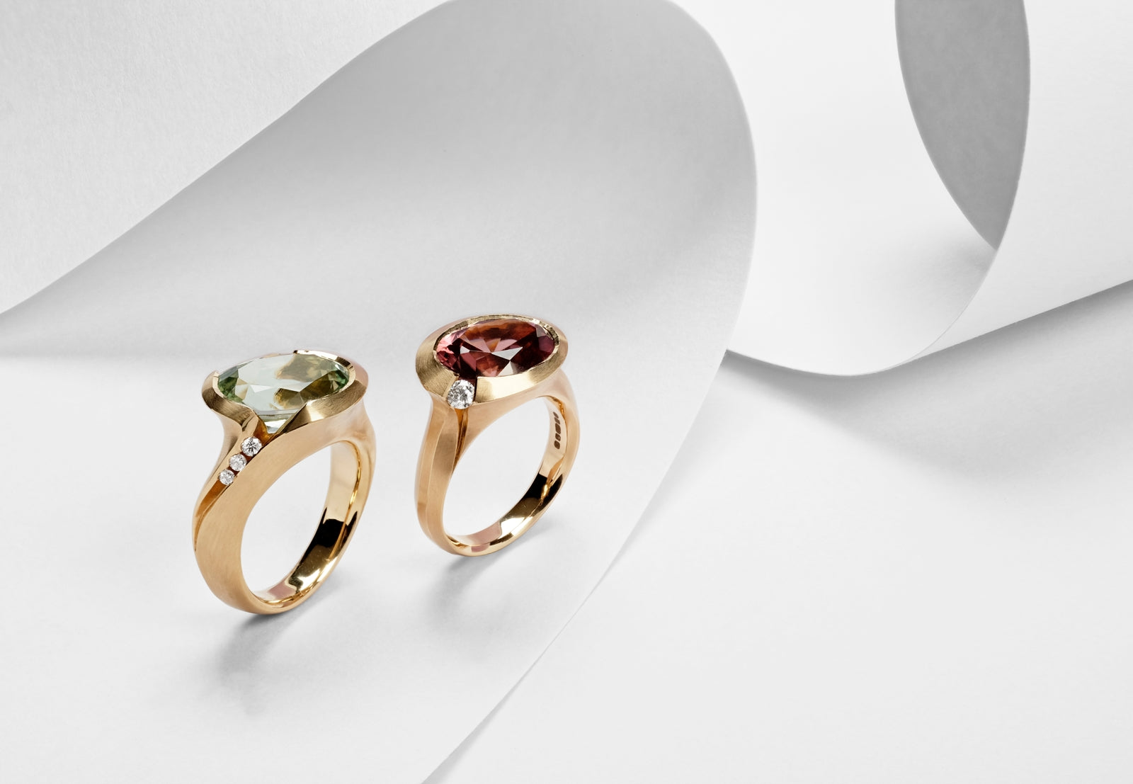 As classically trained goldsmiths, our style and forms are heavily influenced by technique and the properties of the precious metals we work with. We aim to create elegant jewellery that accentuates the curves and contours of the body. Rings gently meander around the fingers and earrings sweep and caress the contours of the neck. Precious metals are hand-forged into sweeping tapered loops; a curve highlighted with lines of tiny diamonds; colourful gemstones inspire one-off creations. Our search for exceptional gemstones regularly takes us to fairs abroad where we source our most remarkable stones.