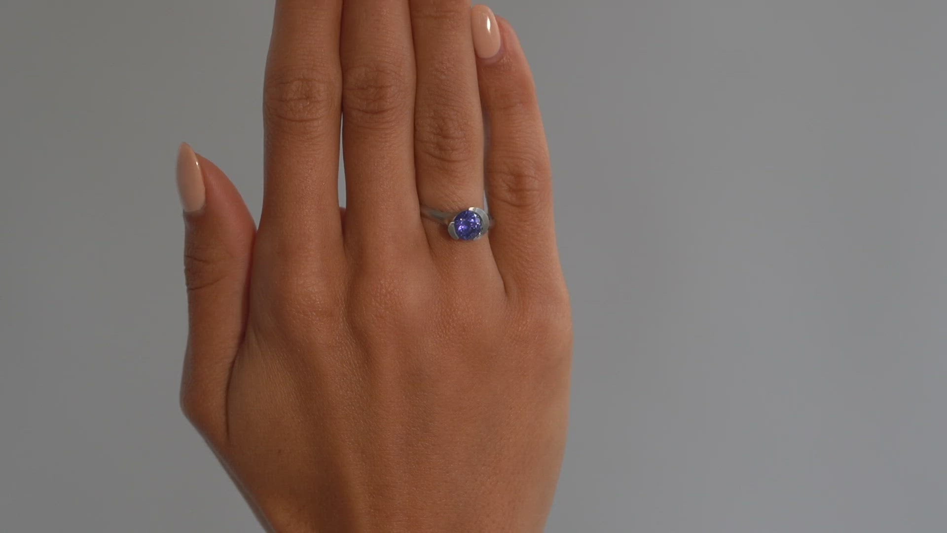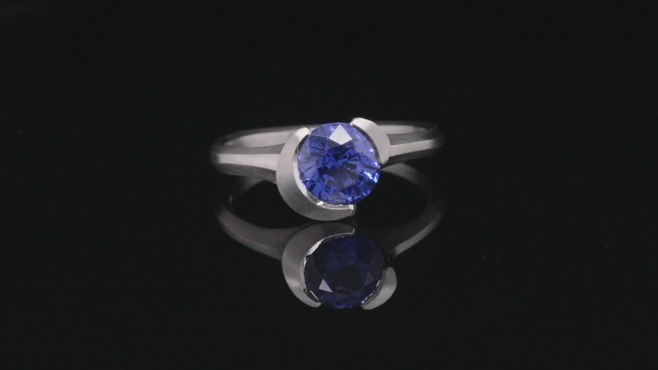 A modern platinum and sapphire ring from our Arris ring series. This sculptural ring is carved by hand to create smooth curves and soft facets. The ring combines cool white platinum with a 1.2 carat sparkling blue sapphire. Asymmetric yet balanced, the ring has been carefully hand carved in wax to create fluid lines and soft facets. A brushed metal finish emphasises the curves of the form.