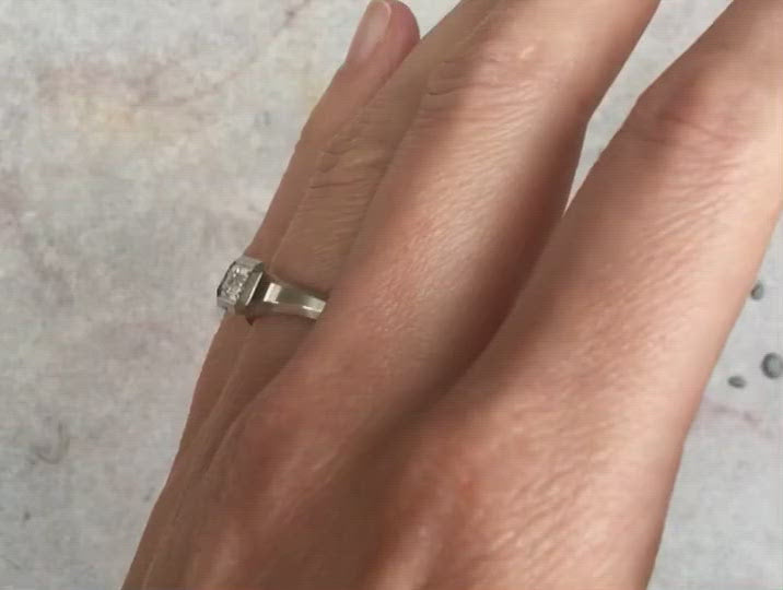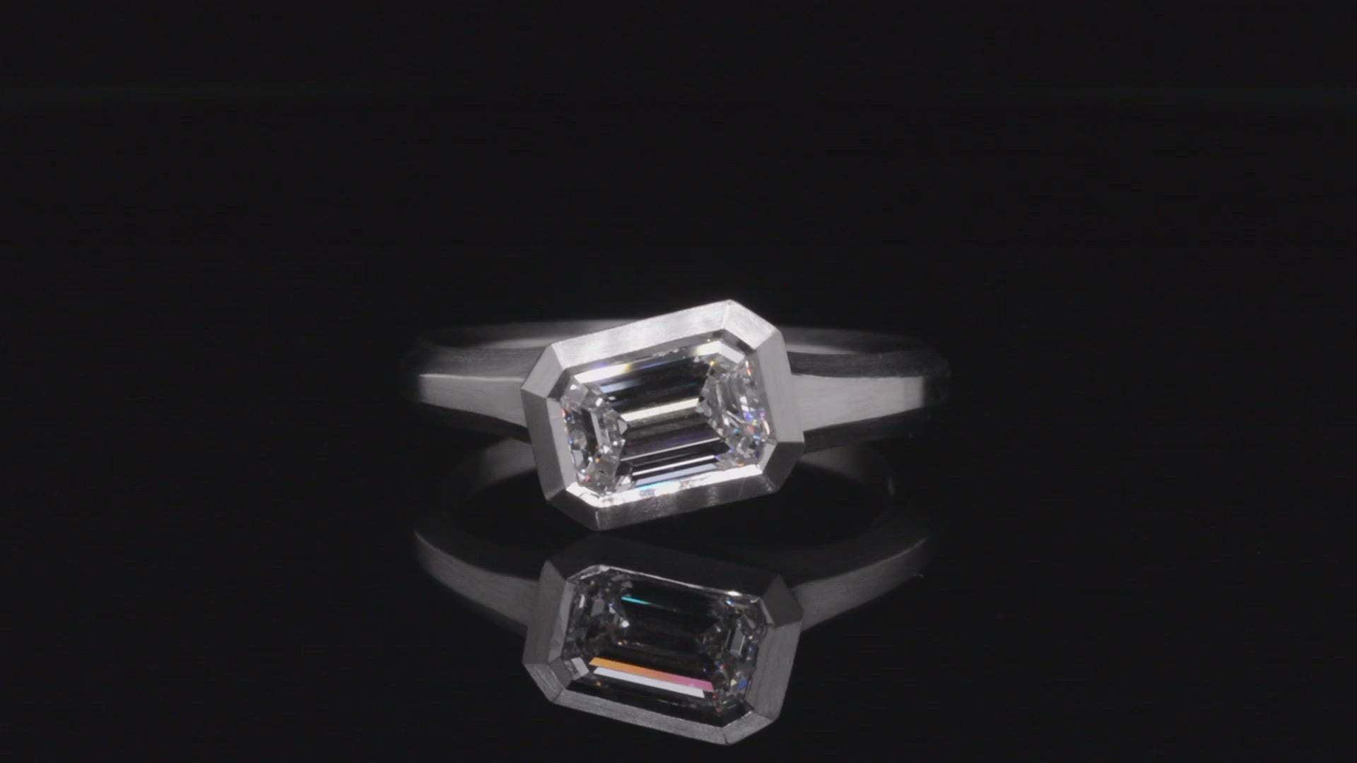 Asymmetric yet balanced, the ring features a 1.0 carat emerald-cut white diamond set at an angle across the finger. A wide brushed platinum bezel around the diamond echoes the angles of its emerald cut. The dramatic contrast between the sparkling diamond and the soft grey of brushed platinum emphasises the diamonds brilliant sparkle.