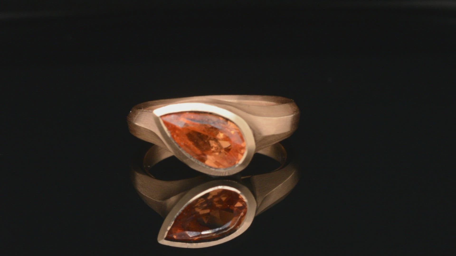 Part of our Arris series of hand-carved rings, this elegantly proportioned rose gold and mandarin garnet ring is ideal for wear either as a dress ring or engagement ring. If desired, a fitted hand-carved wedding band can be made to match.