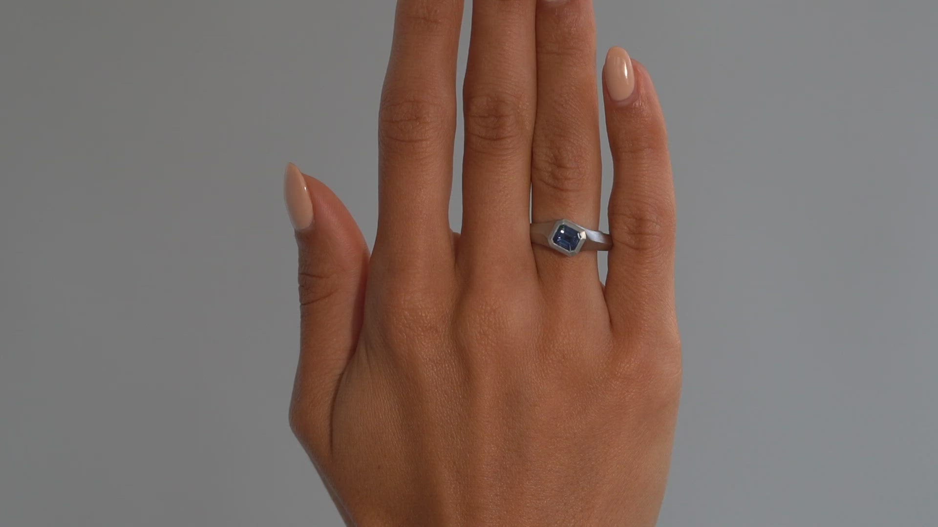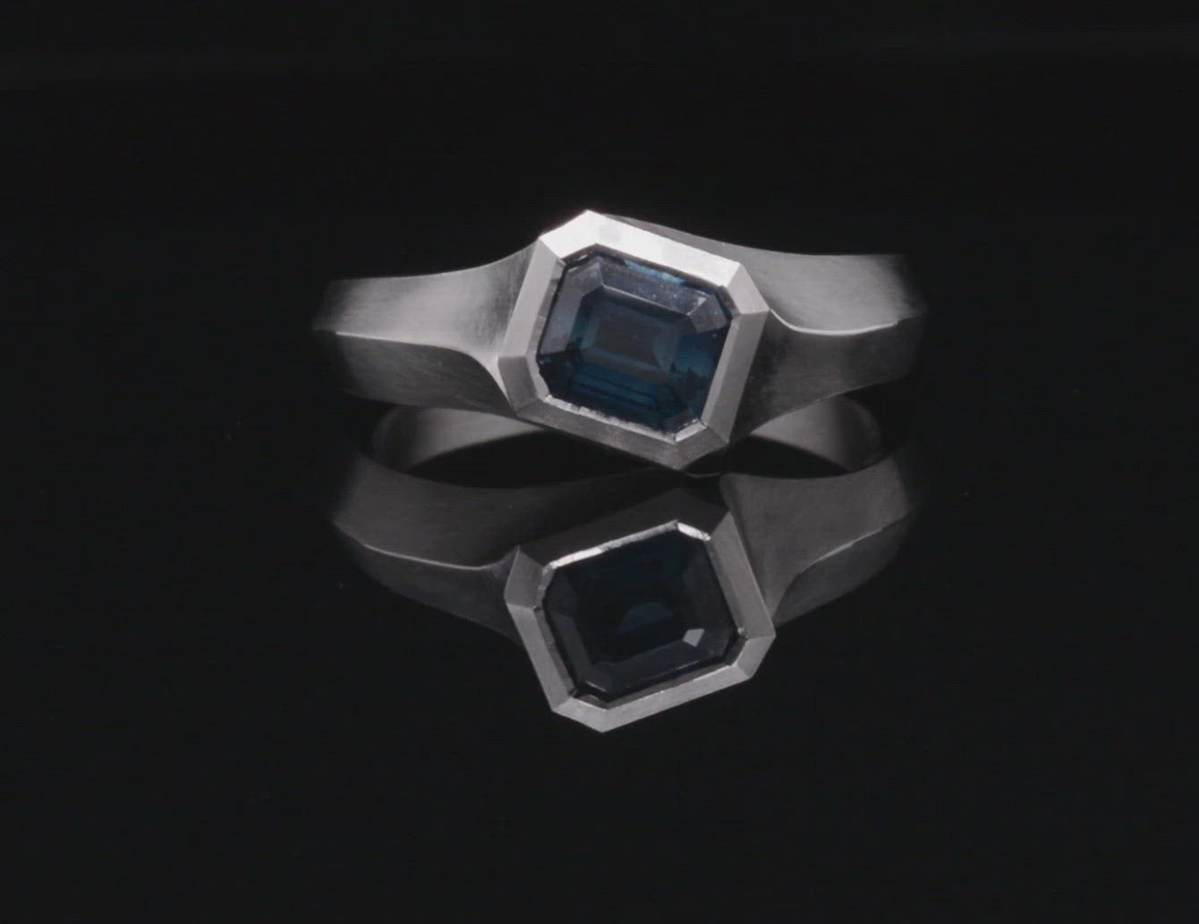 This distinctive asymmetric ring combines a 1.07 carat emerald-cut teal sapphire with cool tones of platinum. This GIA-certified sapphire is set diagonally across the finger and is perfectly balanced by the fluid lines and soft angles of the sculpted platinum setting.