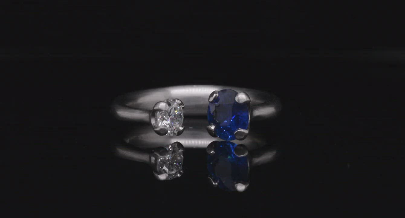 This unusual two-stone sapphire and diamond engagement ring is based on our 4-claw engagement rings. Made from platinum, it has an open band and balances a 0.79 carat blue sapphire with a 0.30 carat white diamond. The rounded band tapers from a wide base, narrowing as it reaches the stones. Each stone is held securely in a sculpted 4-claw setting with softly rounded claws. This minimal, modern design is a twist on the traditional makes an elegant alternative.