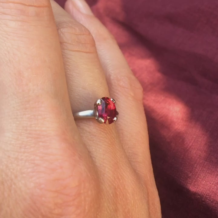 This fiery red spinel has a decadent feeling of luxury. Paired with platinum in a four claw setting, this spinel really shines in this stunning ring.