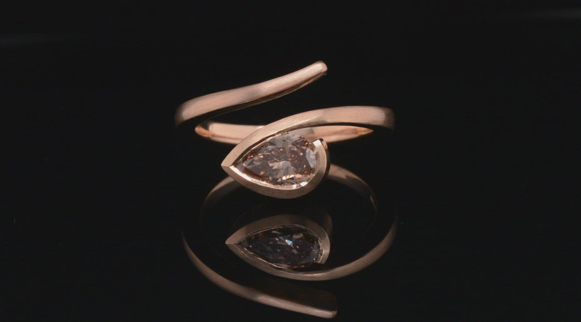 'Twist' rose gold engagement ring with pear shaped cognac diamond