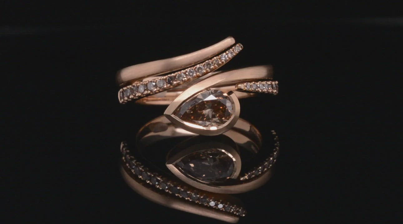 A refined, contemporary design. This stylish 18ct rose gold engagement ring is bezel set with a vibrantly coloured pear shaped, cognac diamond. The ring is hand-forged from a single continuous piece of gold bar and given a brushed satin finish for a distinctive, modern look. Pictured as part of a pair with diamond set fitted wedding band, castelle set with glittering cognac diamonds.