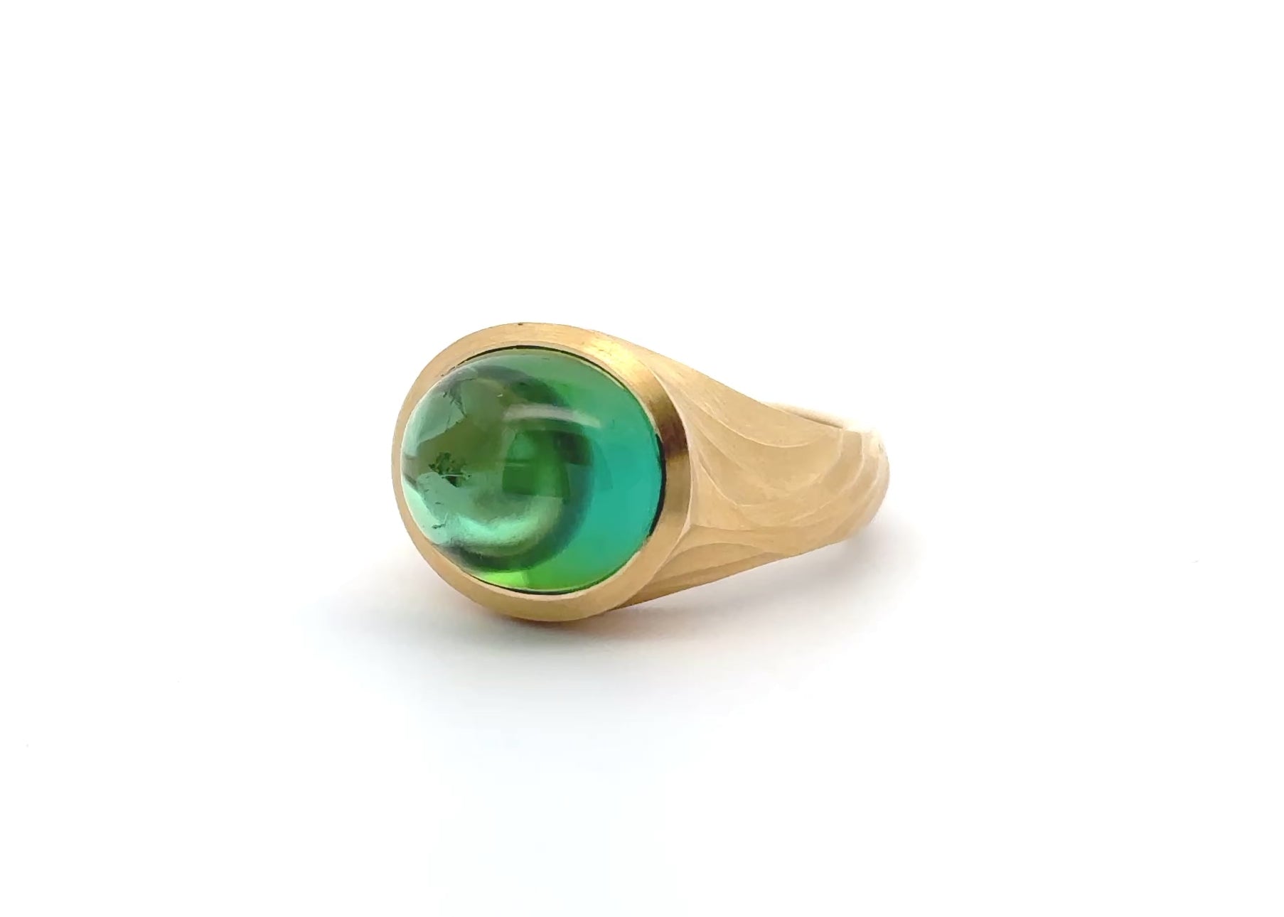 Satin finished yellow gold is paired with a 8.67ct cabochon cut tourmaline in this sculptural cocktail ring. Part of our Arris range, this ring is hand carved to fit its unique gemstone perfectly. The tourmaline is a deep green colour, which looks especially vibrant against the rich tones of 18 carat yellow gold.